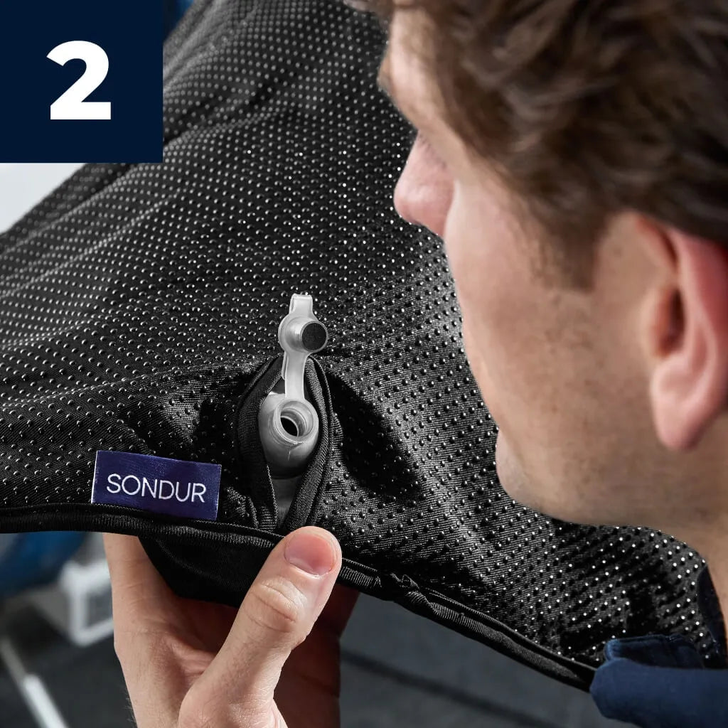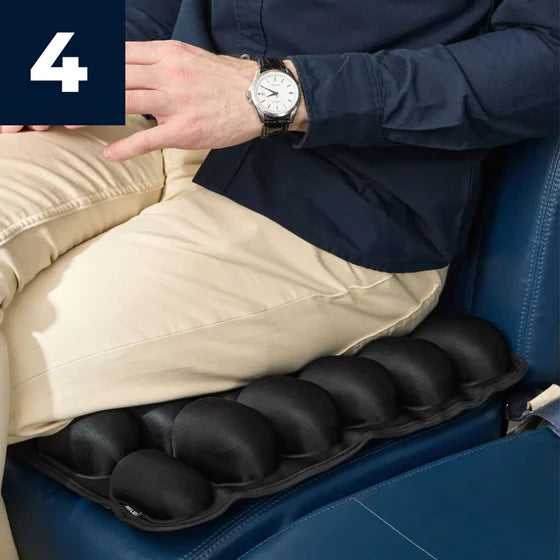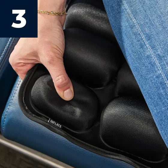 Three breaths to inflate. Place it on any seat. The moment you sit, you feel the difference - your weight disappears into the air cells. No break-in period. Instant cloud.